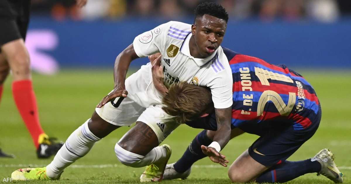 وخلال اللقاء، التحم فينيسيوس بلاعب برشلونة فرينكي دي يونغ، وقام بجره من رقبته، قبل أن يبطحه أرضا، في تصرف غاضب من النجم البرازيلي.
